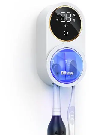Upgraded Tooth Brush Holder for Bathroom 2.0, Infrared Sensing Toothbrush Cleaner, Wall-Mounted for Most Size Toothbrushes, Air Drying, LED Smart Screen, White Gold Trim