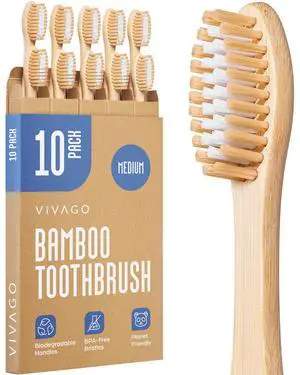Bamboo Toothbrushes Medium Bristles 10 Pack - BPA Free Medium Bristles Toothbrushes for Adults - Eco-Friendly, Natural Wooden Toothbrush