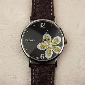 YAZOLE Ladies OL Style Four-leaf Clover Pattern Quartz Watch (338 black plate gold flower brown belt) Brown