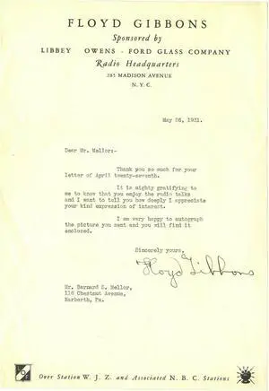 Floyd Gibbons signed 1931 Typed Letter- JSA Hologram #EE62960 (WWI/Pioneer Aviator/Journalist)