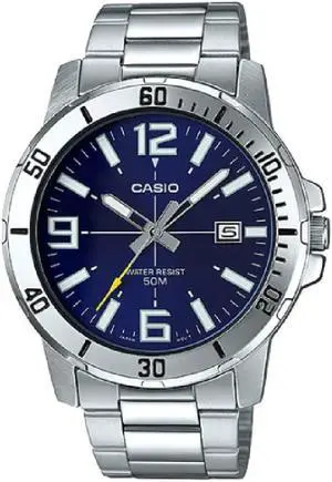 Casio Mens Analog Stainless Steel Band and Case Silver Blue Dial 50-meter Water Resistance Watch MTP-VD01D-2BVUDF