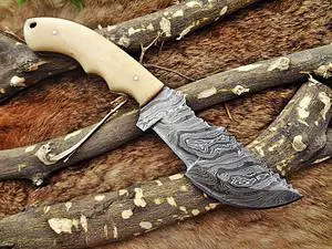 10" Long hand forged twist pattern full tang hand forged Damascus steel tracker knife, Natural Camel bone scale with inserting holes, Cow hide leather sheath White