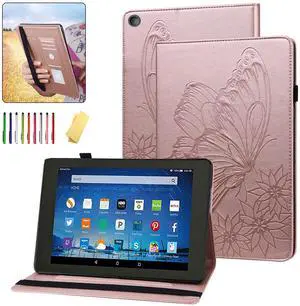UUcovers Fire HD 10 2019/2017/2015 Case 9th/7th/5th Generation 10.1", Slim Folio Stand Wallet with Pencil Holder Elastic Band [Auto Sleep/Wake] Embossed PU Leather Cover, Flower Butterfly Rosegold