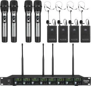 Wireless Microphone System 8 Channel UHF 4 Handheld 4 Bodypack Headset Lapel Mics Fixed Frequency Metal Cordless Microphone for Church Singing DJ Wedding Party Ktv