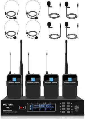 4 Channel Wireless Lapel Microphone, Set of 4 Headset & Lavalier Mics with 4x50 Adjustable Frequency UHF Metal Receiver, 300ft Range Microphone System for Church, Karaoke, Preaching, Wedding