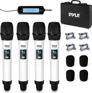 Pyle 4 Channel Wireless Mic System, Portable UHF Receiver, Independent Adjustable Channel Controls, 532-568 MHz Frequency, RF Signal LCD Indicator, Digital Audio Set with 4 Handheld Mics, USB Charging
