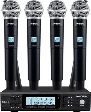 4-Channel UHF Wireless Mic System, Adjustable Frequency, 4 Metal Moving Coil Handheld Mics, 160ft Range, for Church, KTV, Events