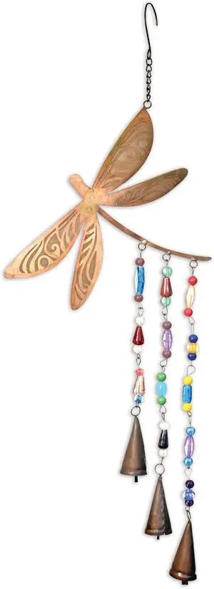Windchimes - Handcrafted Glass Bead & Bells Dragonfly Bell Chime, 10.5" Long, Verdigris