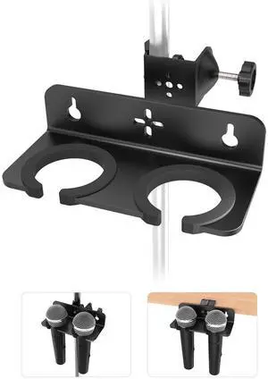Multi Microphone Holder with Clamp (Aluminum/Rubber), Mount on Mic Stand & Desk Edge & Wall, Hold Up to 2 Wired/Wireless Handheld Mics, Ideal for Church, Street Performance, Home Studio, Karaoke