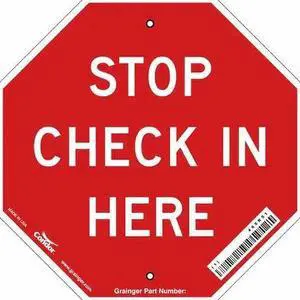 CONDOR 485K51 Stop Check In Sign, 11" W, 11" H, Plastic, Red