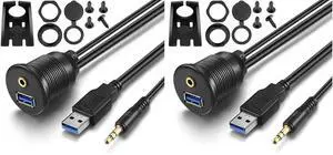 USB Flush Mount - 1M 3ft 3.5mm & USB 3.0 AUX Extension, Dash & Panel Mount Cable for Car, Boat, Motorcycle (Pack of 2)