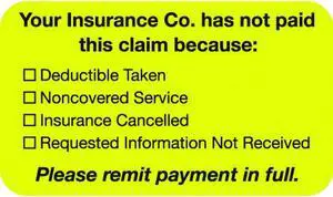 Insurance Labels, Your Insurance Co. has not paid this claim because:, Fluorescent Chartreuse, 1-1/2" x 7/8" (250/Roll)