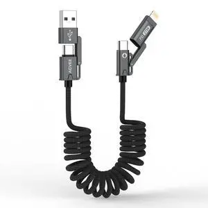 3ft 4-in-1 Coiled Multi USB C Charging Cable, Secure-Slide No-Loss Adapters, Slim Tips Fit Thick Cases, Lightning End Reinforced, PD 60W for iPhone Carplay, Samsung, iPad, Black