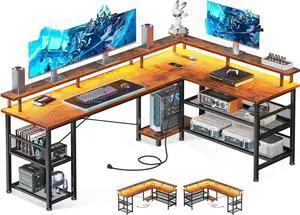L Shaped Gaming Desk with Power Outlet and LED Lights, 59" Reversible L Shaped Desk with Storage Shelves & Monitor Stand, Gaming Desk with USB Ports, Home Office Desk, Rustic Brown