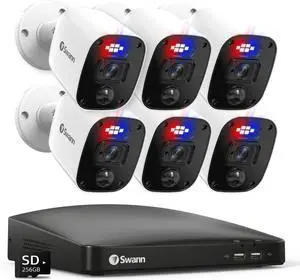 Swann Home Security Camera System,6 Cams H.265 Wired with Person Vehicle Detection, 2k 8CH Surveillance DVR Kit-Deterrent Red & Blue Lights, Color Night Vision,24/7 Recording,8468562KMQB