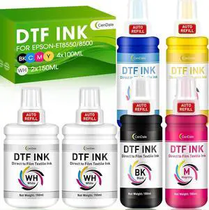 Upgraded Auto-Fill DTF Ink - 700ML DTF Transfer Ink for Epson ET-8550 ET-8500 Printers, Heat Transfer Printing Ink Set 100ml x 4 CMYK, 150 x 2 White (Anti-UV/ICC-Free)