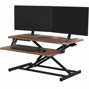 • Features: Flat Panel Display Type Supported - 19.50" Height x 35.50" Width x 23.25" Depth - Desktop - Steel, Medium Density Fiberboard (MDF), Polyvinyl Chloride (PVC) - Black - Gas Lift Desk riser allows you to go from sitting to standing with ease. Stop at any position from 6-1/4" x 19-1/2" when adjusting the height. Desk riser operates with a double gas-spring monitor lift for smooth, easy ascension. The top worksurface includes a convenient iPad/iPhone slot. Quick-release keyboard tray provides easy reach to your keyboard even when standing and can detach easily when necessary. Keyboard tray is curved slightly for easy, ergonomic access to your keyboard while maintaining ample room on both sides for your mouse or other supplies. The frame is made of sturdy steel. Worksurface and tray are made of medium-d...