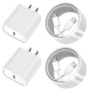 10ft Cable for Apple iPhone 16 15 Pro Max Charger Fast Charging iPad AirPods 4 (USB-C), 20w Type C Blcok 10-ft Long USB C to C Cord White 1Pack