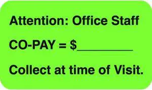 Insurance Labels, Attention: Office Staff, Co-Pay = ___, Fluorescent Green, 1-1/2" x 7/8" (Roll of 250)