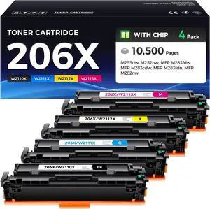 206X 206A High Yield Toner Cartridges 4 Pack (with Chip) Works with HP Color Pro MFP M283fdw M283cdw, Pro M255dw M255nw, MFP M282nw M283 M282 M255 Printer | W2110X W2111X W2112X W2113X 206A W2110A