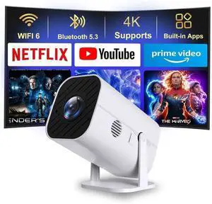 Smart Projector with WiFi and Bluetooth, Mini Projector Supports 4K 1080P, Portable Movie Projectors Built-in Apps, Compatible with HDMI/USB/Smartphone/TV Box/Laptop for Bedroom, Office, Outdoor Use