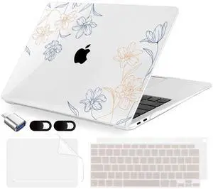 MecBevia Compatible with MacBook Air 13.3 inch Case 2021-2018 Release A2337 M1 A2179 A1932 Touch ID, Plastic Hard Shell&Keyboard Cover&Screen Protector&Webcam Cover&Type-C Adapter, Engraved Floral