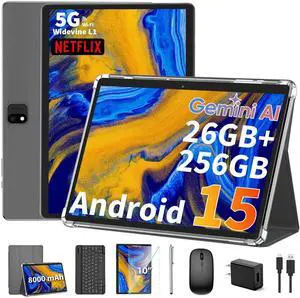 2025 Android 15 tablet with keyboard, 26GB+256GB+2TB Expand, 10 inch 2-in-1 Tablets with 8-Core, 5G WiFi, 8000mAh, BT5.0, 5MP+13MP, GMS, GPS, Widevine L1, Tablet PC with Mouse, Case, Stylus (Black)