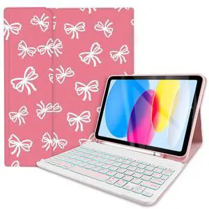 TopPerfekt with Bluetooth Keyboard for iPad 10th Gen 10.9 inch (2022) case, (A16) 11th/ 10th Gen Case 11''(2025) with 7-Color Backlights, White Bow Cute Chic Adorable with Pencil Holder,Pink-White Bow