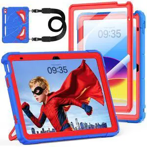 Case for iPad A16 11th Generation 11 Inch 2025, Auorld for iPad 10th Generation 10.9 inch 2022 case Kids Boys with Screen Protector Foldable Stand Shoulder Strap Pencil Holder Shockproof, Blue red