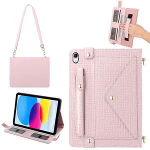 Handbag Case for iPad 11th Gen A16 2025/10th Gen 2022 10.9-inch, Techcircle Elegant Crossbody Folio Stand Wallet Case with Pencil Holder, Card Slots, Hand Strap, Shoulder Strap, Baby Pink