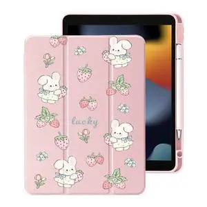Cute Kawaii Bunny Strawberry for iPad (A16) 11th Generation Case 11 Inch 2025, for iPad 10th Generation Case 10.9 Inch 2022 with Pencil Holder, Auto Sleep/Wake, Pink Leather Clear Acrylic Back Cover