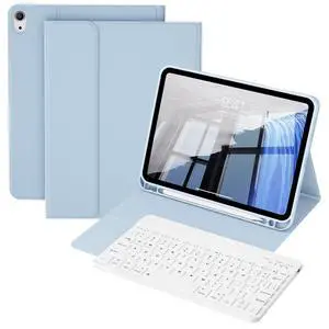 KVTVOU Aesthetic Keyboard Case for iPad (A16) 11th/10th Generation 11/10.9 Inch, Detachable Wireless Bluetooth Fast Pairing Keyboard, Built-in Pencil Holder, Durable Soft TPU Folio Cover, Sky Blue