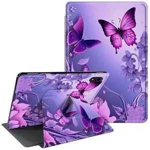 Case for iPad (A16) 11th Generation 11 inch 2025/10th Generation 10.9 inch 2022 360 Degree Rotating Stand Protective Smart Cover with Auto Wake Sleep Case - Pink Flowers Purple Butterflies