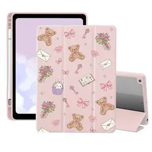 Cute Kawaii Bear Floral Case for iPad (A16) 11th Generation 2025 11" /iPad 10th Generation 2022 10.9" with Pencil Holder Trifold Stand Pink Leather Girly Cover Clear Back Shell Auto Wake/Sleep
