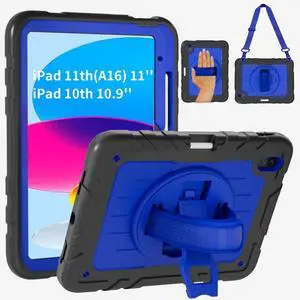 PZJI Case for iPad (A16) 11th/10th Generation 11''/10.9'' 2025/2022, Sturdy Heavy Duty Full-Body Shockproof Protective Case, 360 Rotating Stand, Hand/Shoulder Strap, (Black+Blue)
