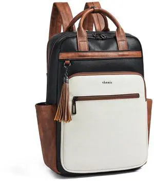 Shrrie Laptop Backpack for Women 15.6 inch Travel Leather Backpack Purse Work Computer Backpacks for Business College Black With Brown and White
