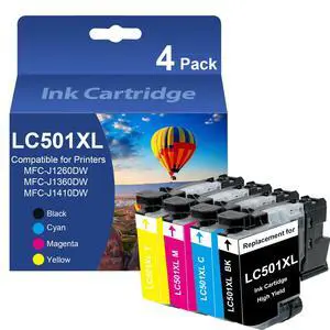 High Yield LC501 LC501XL Ink Cartridges LC501XLBK LC501XLC LC501XLM LC501XLY Ink Replacement for INKvestment 1260 1360 1410 MFC-J1260DW MFC-J1360DW MFC-J1410DW (4 Pack-Black/Cyan/Magenta/ Yellow)