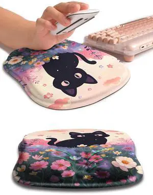 Hokafenle Ergonomic Wrist-Hugging Mouse Pad Wrist Support, U-Shaped Holding Wrist Rest Mousepad for Carpal Tunnel Pain Relief with Cushioned Memory Foam Slope Massage Bulge (10.2x8.3 in,Flower Cat)