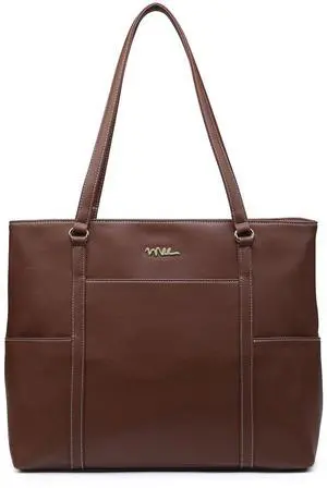 NNEE Classic Laptop Leather Tote Bag for 15 15.6 inch Notebook Computers Travel Carrying Bag with Smart Trolley Strap Design - Dark Brown