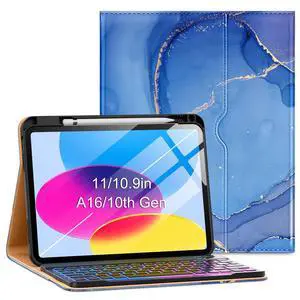 VIKESI Keyboard Case for iPad (A16,2025) 11th Generation/iPad 10th Generation Case (10.9" 2022),Premium Leather Smart Cover,Built-in Breathing Light,Function Row,Pencil Holder,Card Slots -Ocean Marble