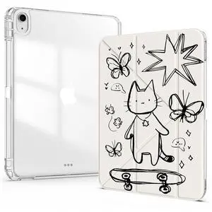Idocolors Cute Case for iPad 7th/8th/9th Gen 10.2 Inch iPad 2019/2020/2021, Clear Acrylic Back Case with Pencil Holder, Detachable Mutil Angles Folding Y-Shaped Stand Cover, Hand-Drawn Cat
