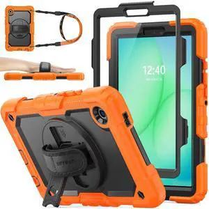 SEYMAC stock Case for Samsung Galaxy Tab A11 8.7'', Full-Body Drop Protection Case with Screen Protector Pencil Holder [360 Rotating Hand Strap] &Stand, Orange+Black