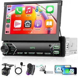 Single Din Flip Out Car Stereo Touch Screen Wireless Carplay Android Auto, 7 inch Car Radio 1 Din Bluetooth Support FM/EQ USB/Type-C SWC, Driauto Car Audio Receiver MP5 Player with Backup Camera