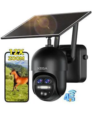 Xega 4G 12X Hybrid Zoom Cellular Security Camera Outdoor with Dual Lens, 2K Solar Wireless PTZ Outdoor Surveillance Camera,Smart PIR Human/Motion Detection, Two Way Talk, Built-in SIM Card, IP66