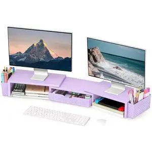 Elephance Dual Monitor Stand with USB Ports,Wood Computer Monitor Stand with Drawer,Adjustable Monitor Stand Riser,Desk Organizer for PC,Computer,Laptop,Purple Pink