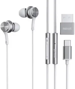 Maxell USB-C Wired Earbuds with USB-A Adapter, Built-in Microphone with Volume and Track Control, Compatible with All Devices with a USB-C and/or USB-A Port, Immersive Digital Chipset, White, 197293