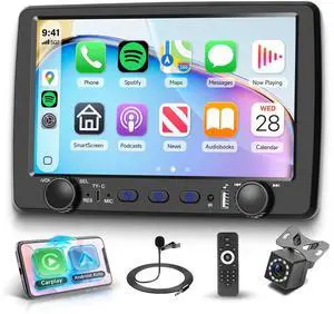 Rimoody Single Din Car Stereo with Wireless Carplay & Android Auto, 9 Inch Touchscreen Car Audio Receiver, Mirror Link, Bluetooth Handsfree/FM/, Backup Camera, SWC, USB/Type-C, EQ, Remote Control