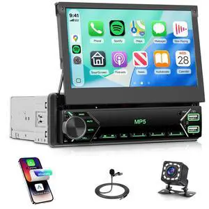 Rimoody Car Stereo Single Din Wireless Carplay Android auto, Flip Out Car Radio with Bluetooth 7 Inch Touch Screen, EQ, FM, Mirror Link, Type-C, USB-2 + Rear View Camera