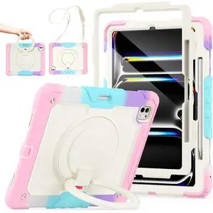 SCSVPN Case for iPad Pro 13 Inch 2024 (M4, 7th Generation), Shockproof Rugged Protective Kids Cover with Screen Protector - Pencil Holder - 360 Rotating Stand - Handle - Shoulder Strap, Rainbow Pink