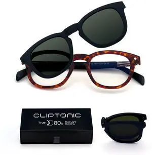CLIPTONIC 2-in-1 Magnetic Clip- On Blue Light Blocking Glasses Round Semi Cat-Eye Tortoise Frame + Green Polarized UV400 Clip, TR90 Lightweight, Anti- Reflective Computer Eyewear for Men & Women